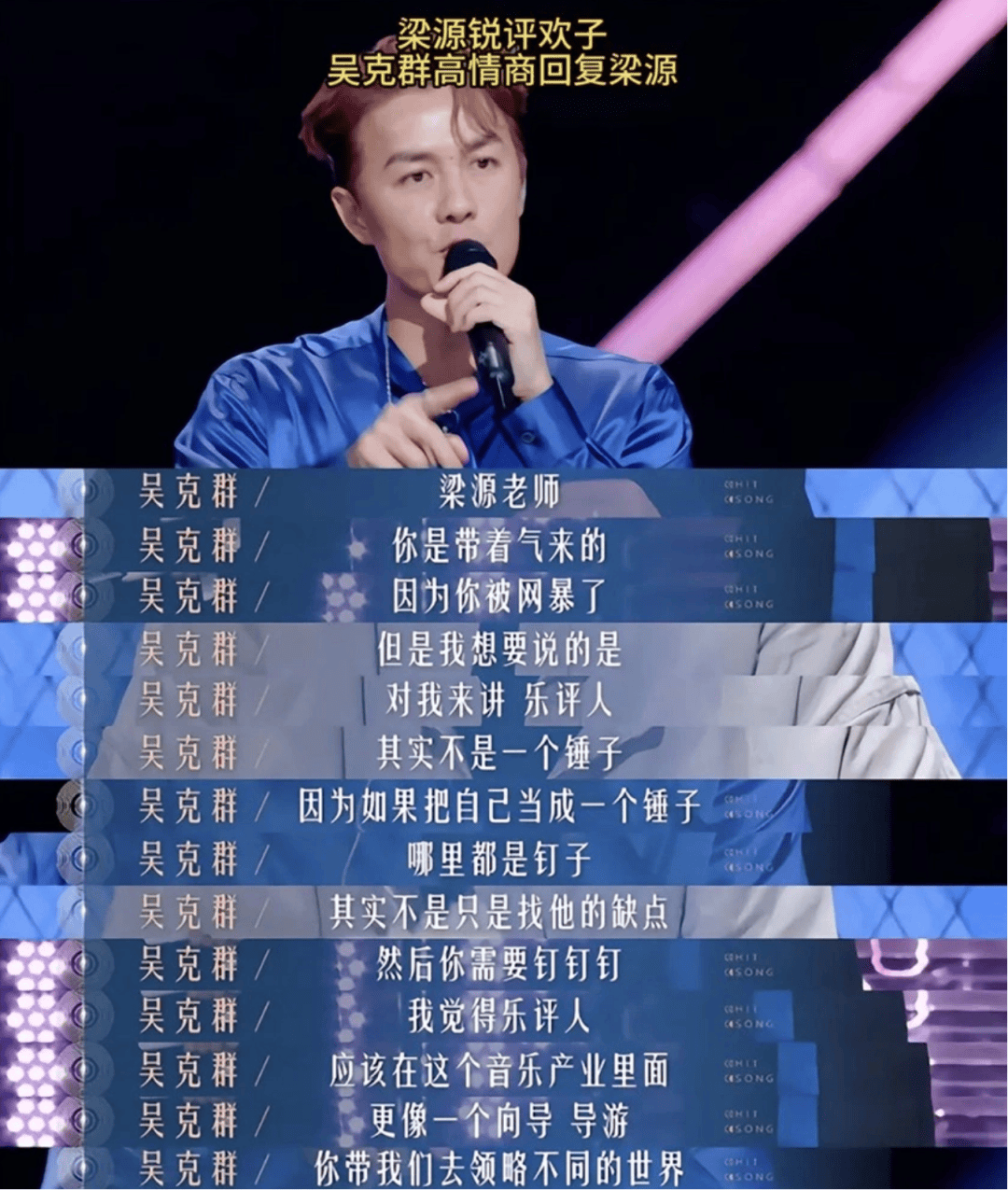 对于热度和流量,吴克群的理解是:“热度是你心跳加快时的血液温度,流量是让你实正落泪,让你的眼中潮湿的那些泪水才是流量。”。