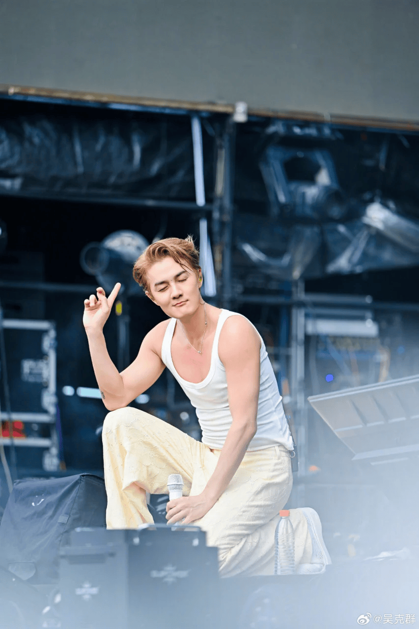 吴克群却仍然顶着一头茂密的黄毛,穿戴白背心,显露健壮的肱二头肌,正在舞台上肆意唱跳,笑容敞亮,和二十年前几乎一模一样。